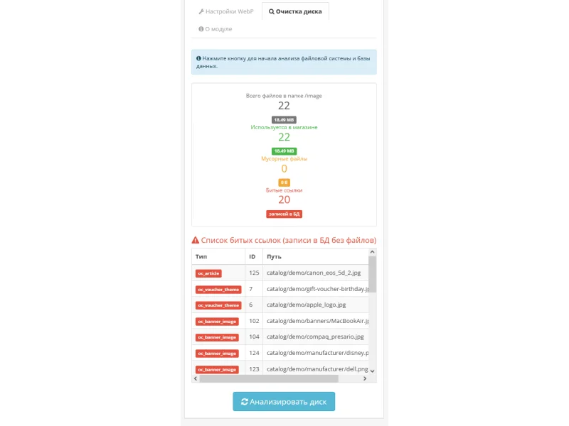 - Интеллектуальный сканер: Модуль сопоставляет файлы на диске с базой данных (товары, категории, производители, баннеры) и находит файлы-сироты.